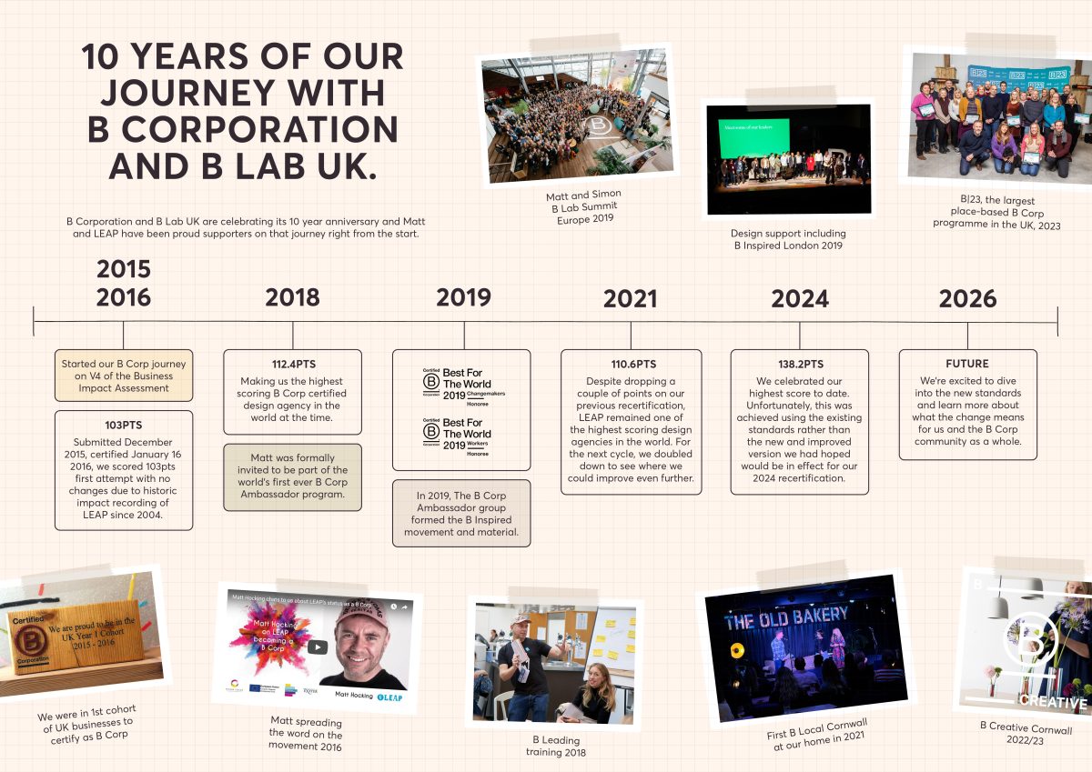 B Corp has been part of LEAP’s story for over a decade. Our founder Matt was following the movement before it reached the UK and became one of its early ambassadors here. Now, with more than 2,700 businesses certified, the UK is home to the largest B Corp community in the world, and Cornwall has more than 80 of them. Both Matt and our MD Simon are qualified B Leaders and have supported hundreds of businesses with their certification over the years.