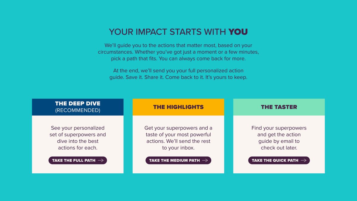Project Drawdown – the world’s leading guide to science-based climate solutions – and renowned climate scientist and author Dr Kimberly Nicholas have collaborated on a research-backed guide, to show people where they have the biggest opportunities to make a difference. But to scale its reach and impact, they needed a more engaging, adaptable tool – one that could give people a plan of action tailored to their lives. The climate crisis is overwhelming and feelings of anxiety and even guilt can lead to action paralysis, the idea of this project was to make it easier for people to understand what they can do.